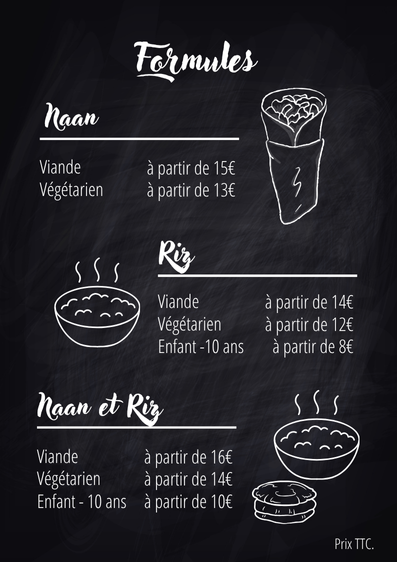 Le plat de votre choix servi avec du riz et un naan (nature ou fromage +1€TTC/pers.).